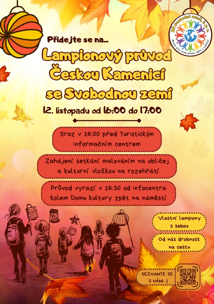 ZŠ Svobodná zve, š.p.o. vás zve na lampionový průvod Českou Kamenicí. Sraz v 16:00 před Turistickým informačním centrem. Zahájení setkání malováním na obličej a kulturní vložkou na rozehřátí.