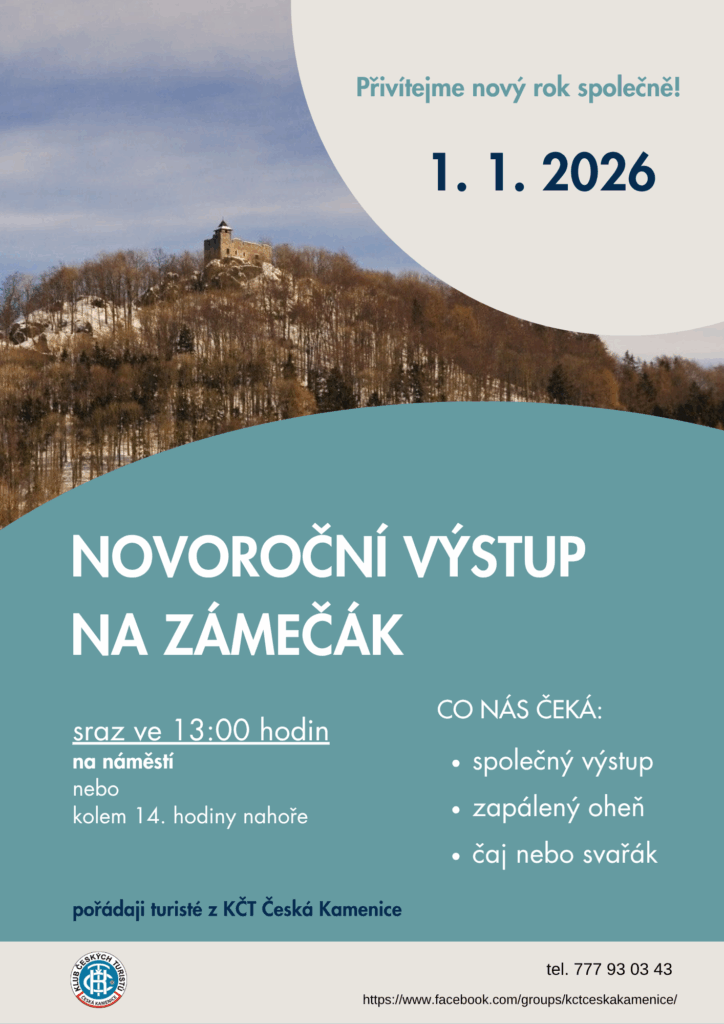 KČT Česká Kamenice vás zve 1.1.2026 na Novoroční výšlap na Zámečák. Sraz ve 13:00 před TIC nebo ve 14:00 nahoře.