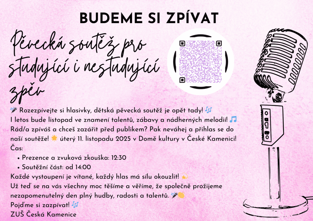 ZUŠ Česká Kamenice vás zve 11. listopadu od 14:00 do DK na pěveckou soutěž pro studující i nestudující.