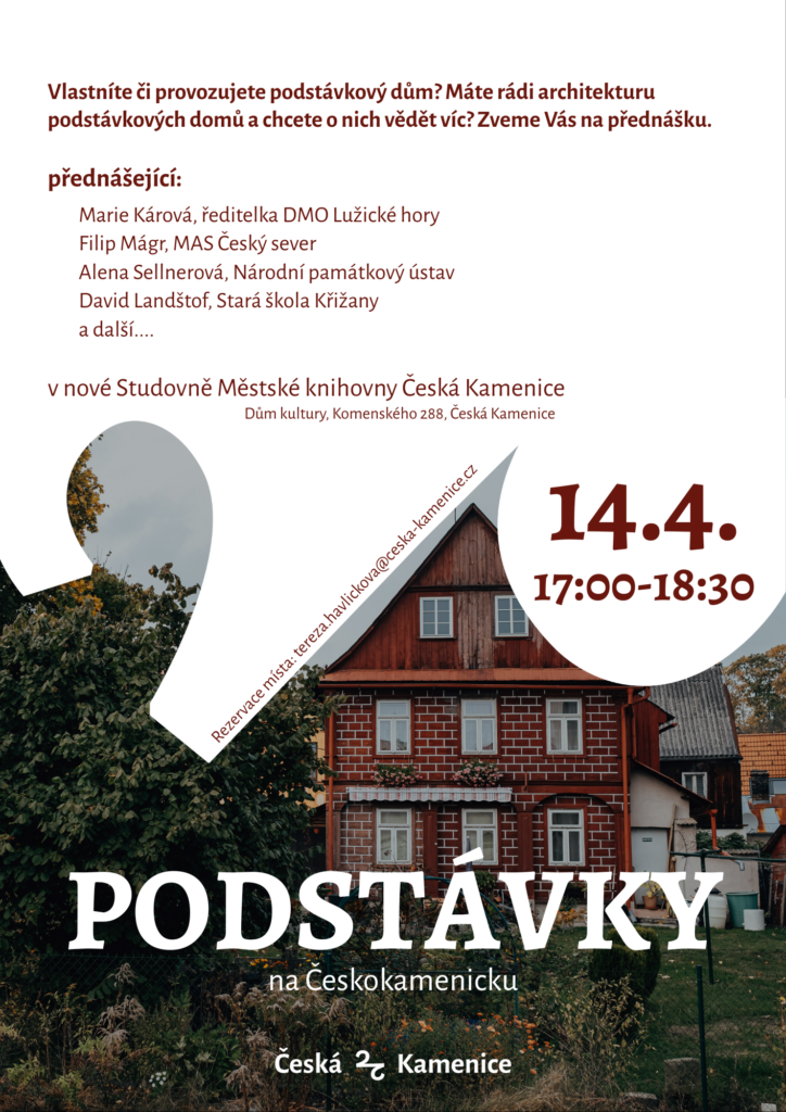 Zveme vás na přednášku o architektuře podstávkových domů, kterou jsme pro vás připravili na úterý 14. dubna od 17:00. Přednáška se bude konat v prostorách nové městské knihovny v kulturním domě (Komenského ul., č.p. 288).