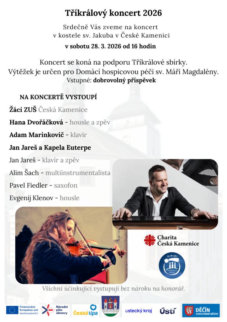 Charita Česká Kamenice vás zve 28.3. od 16:00 na Tříkrálový koncert do kostela sv. Jakuba Staršího. Koncert se koná na podporu Tříkrálové sbírky. Výtěžek je určen pro Domácí hospicovou péči sv. Máří Magdalény.