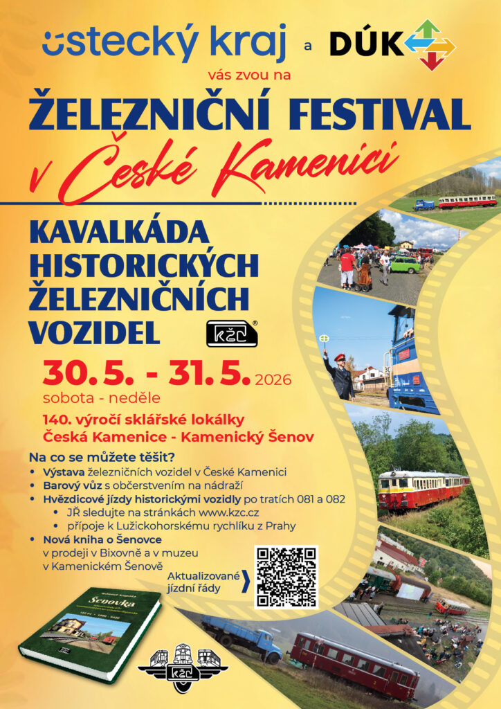 Ústecký kraj a DÚK Vás zvou v termínu 30.5.-.31.5.2026 na železniční festival v České Kamenici k příležitosti 140. výročí sklářské lokálky Česká Kamenice – Kamenický Šenov. Kaválkáda historických železničních vozidel.